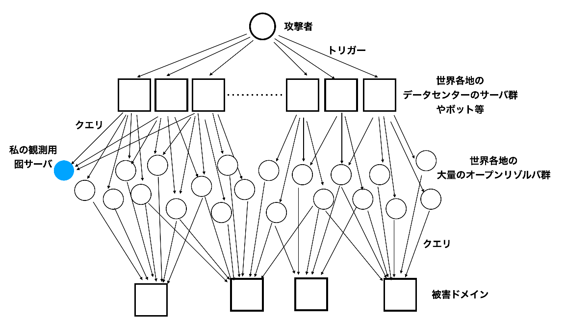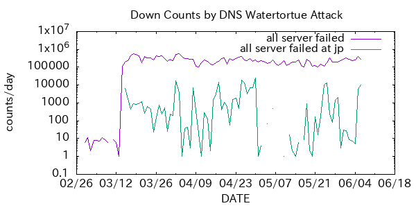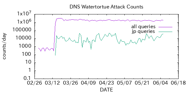 攻撃元はいずれも 1 IP アドレスのみで、1/4 qps (リミット前でも推定 数qps) の緩慢な攻撃であり膨大な数 (少なくとも数千) の踏み台の使用が推察される。